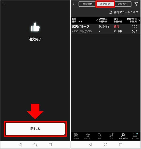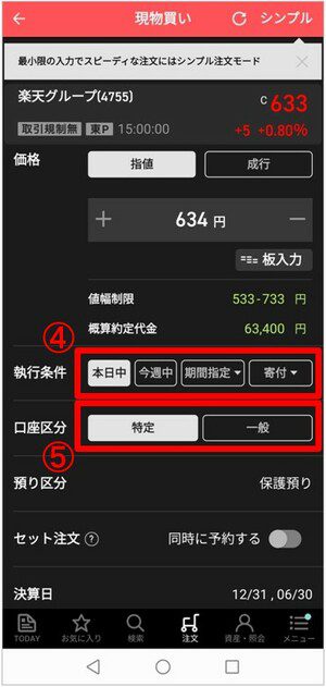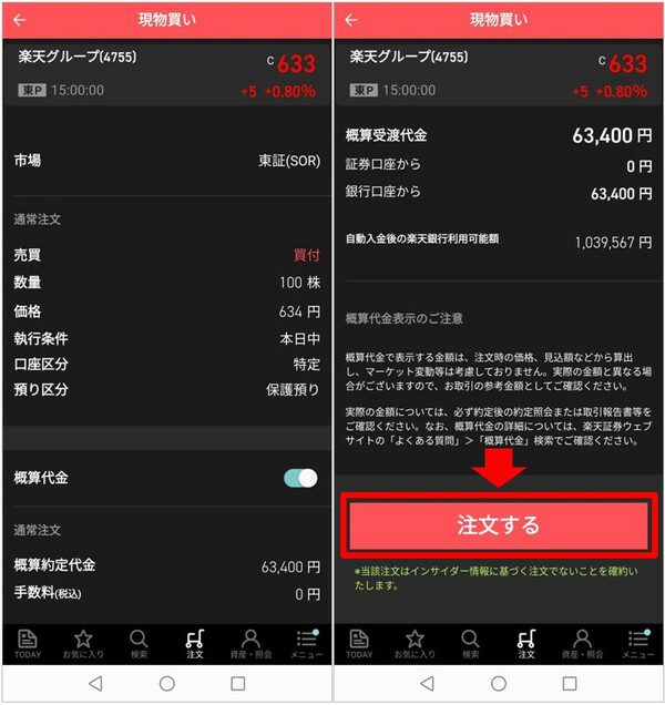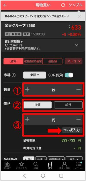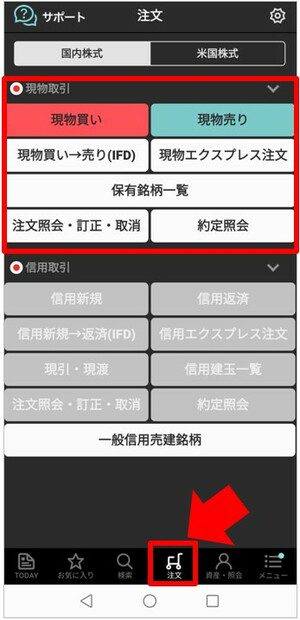 Dưới cùng của màn hình là menu đặt “Mua cổ phiếu 「現物買い」”.