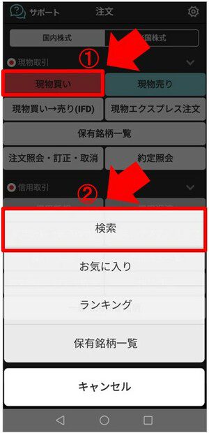Từ “Mua chứng khoán「現物買い」, nhấn vào “Tìm kiếm”「検索」 để tìm mã cổ phiếu bạn muốn mua