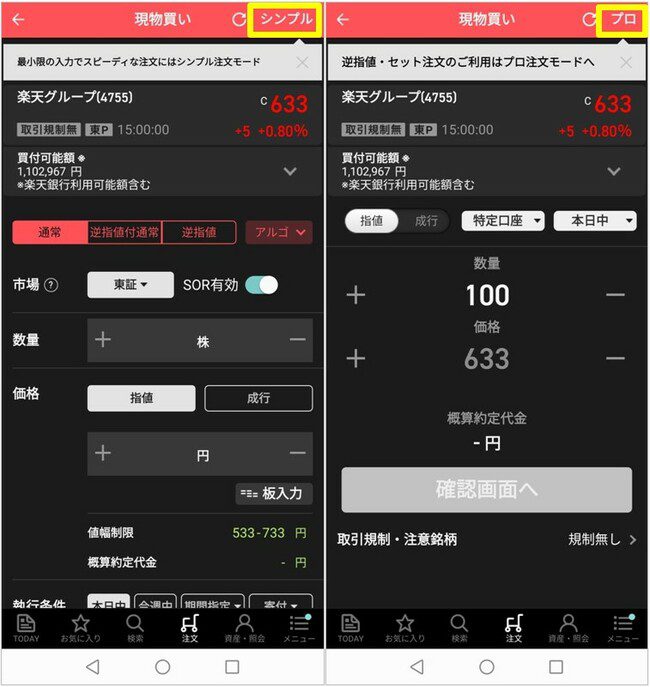 Bạn chọn “Chế độ đặt hàng đơn giản” , nhưng bạn có thể dễ dàng chuyển sang “Chế độ đặt hàng chuyên nghiệp” bằng cách nhấn “シンプル” hoặc “プロ” ở phía trên bên phải.