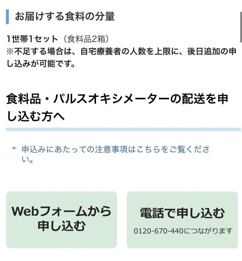 - Cách thức: Đăng ký online hoặc gọi điện. Nếu bạn đang sống ở Tokyo thì bạn click vào ĐÂY để đăng ký nhé. Còn nếu bạn đang sống ở ngoài Tokyo thì bạn có thể tìm kiếm với từ khoá 自宅療養食料食料品の配送を申し込む + tên tỉnh thành bạn đang sống ( như 千葉県、神奈川県 ,…)